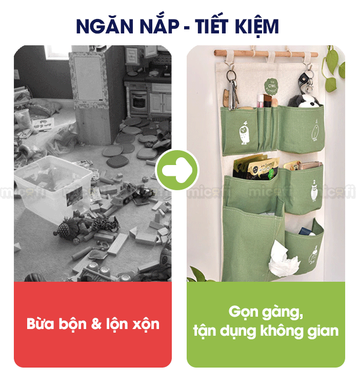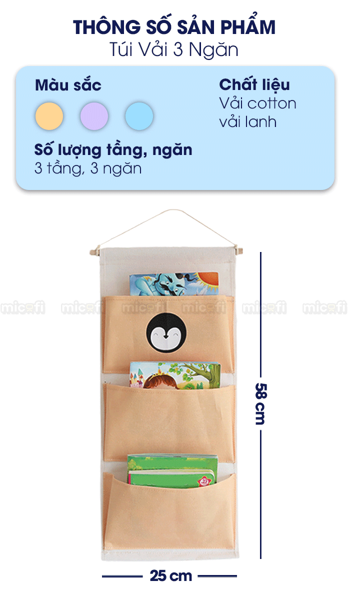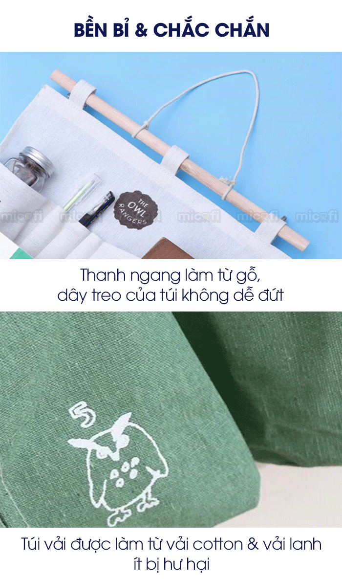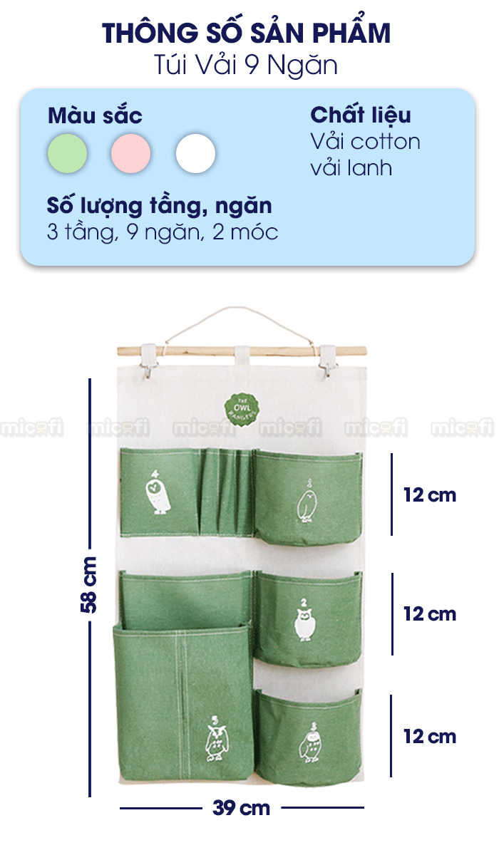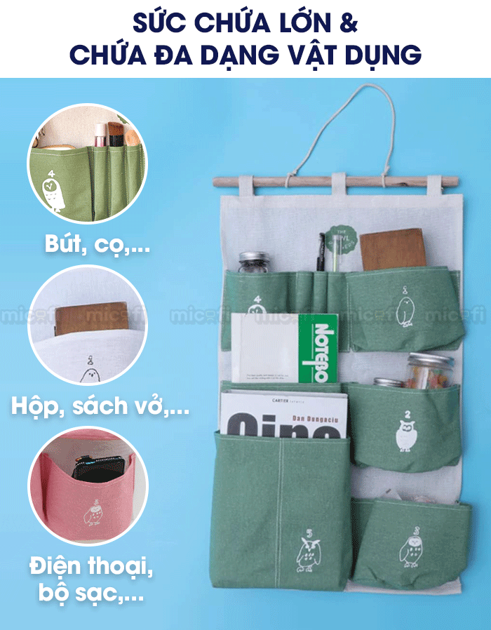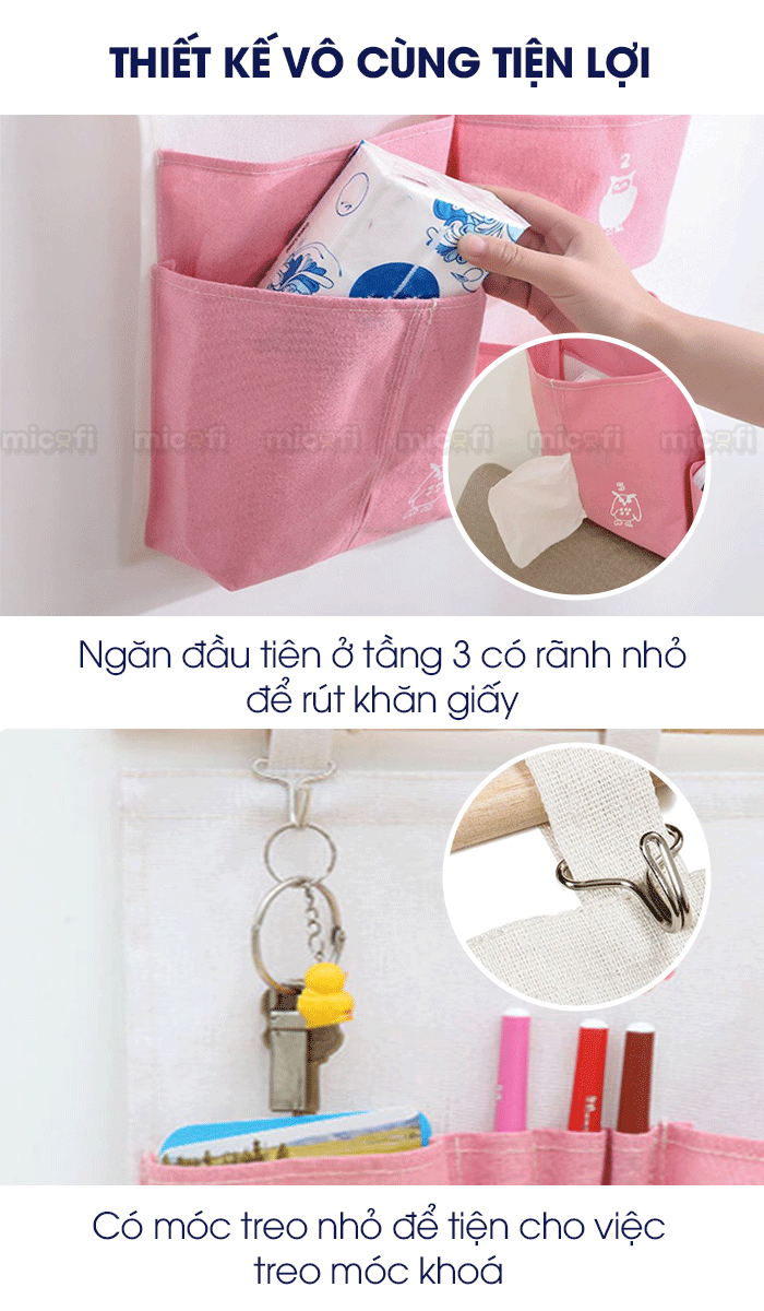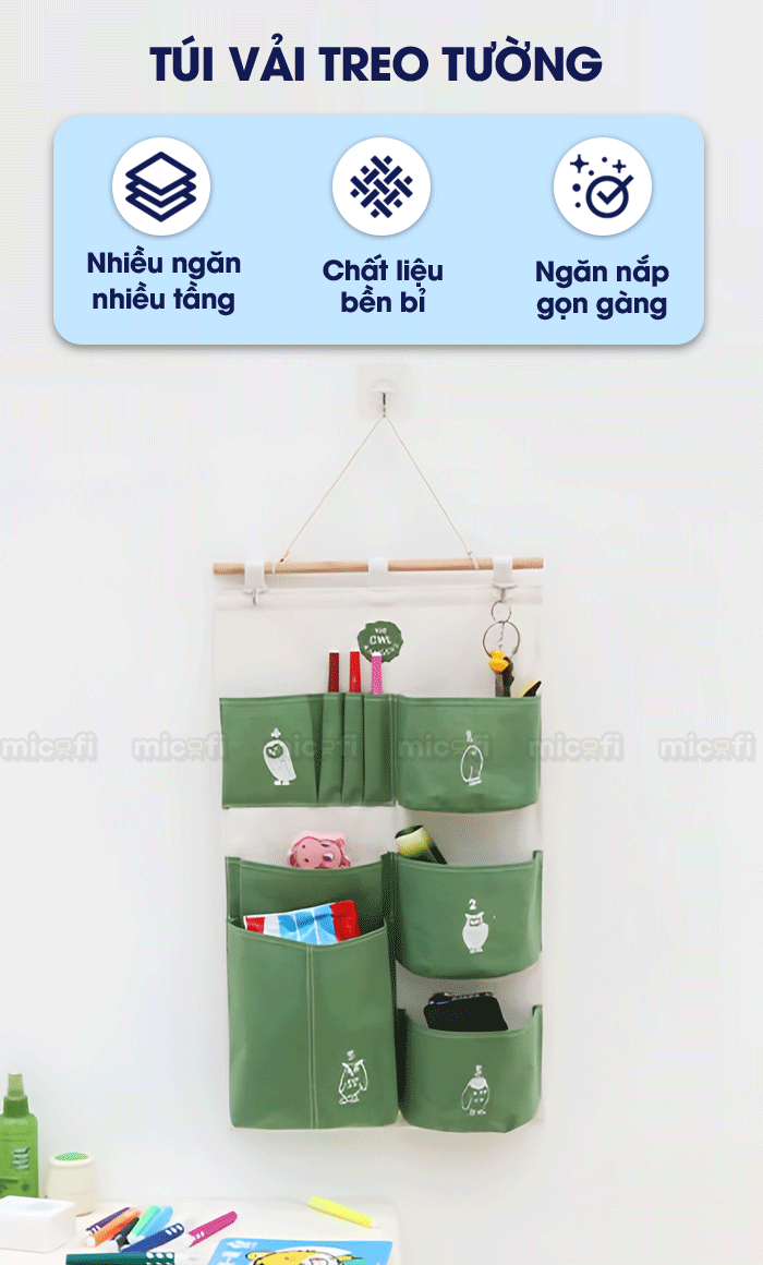 Túi vải là lựa chọn thông minh giúp tiết kiệm không gian bằng cách treo trên tường, cửa phòng. Với nhiều ngăn và tầng, túi mang đến sức chứa lớn và thuận tiện cho việc lưu trữ đồ vật. Đồng thời, các ngăn linh hoạt có thể đựng đa dạng vật phẩm từ bút, mỹ phẩm đến điện thoại. Thiết kế thông minh với móc khoá và rãnh rút khăn giấy giúp tăng tính tiện lợi. Sản phẩm còn được làm từ chất liệu bền bỉ là vải cotton và vải lanh.